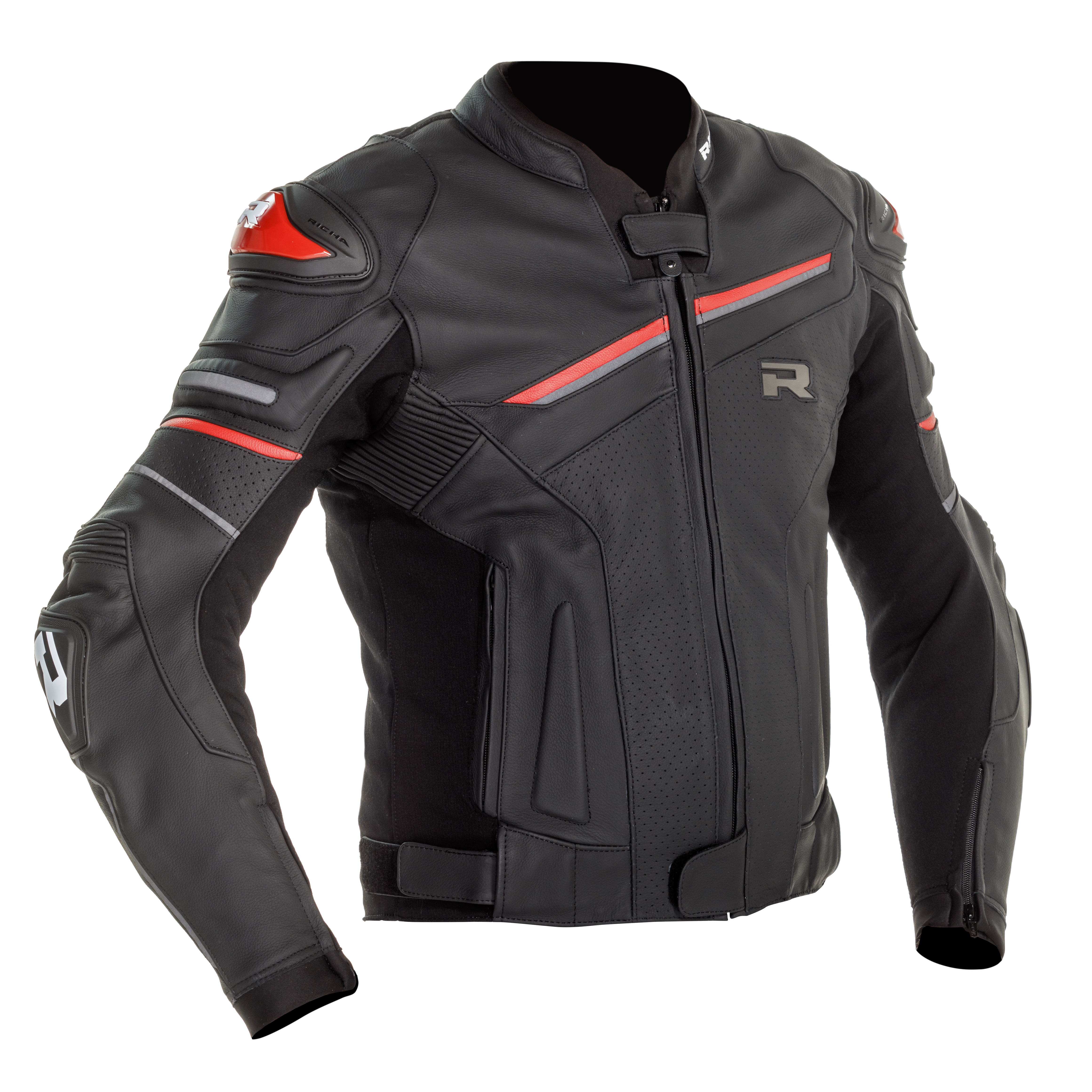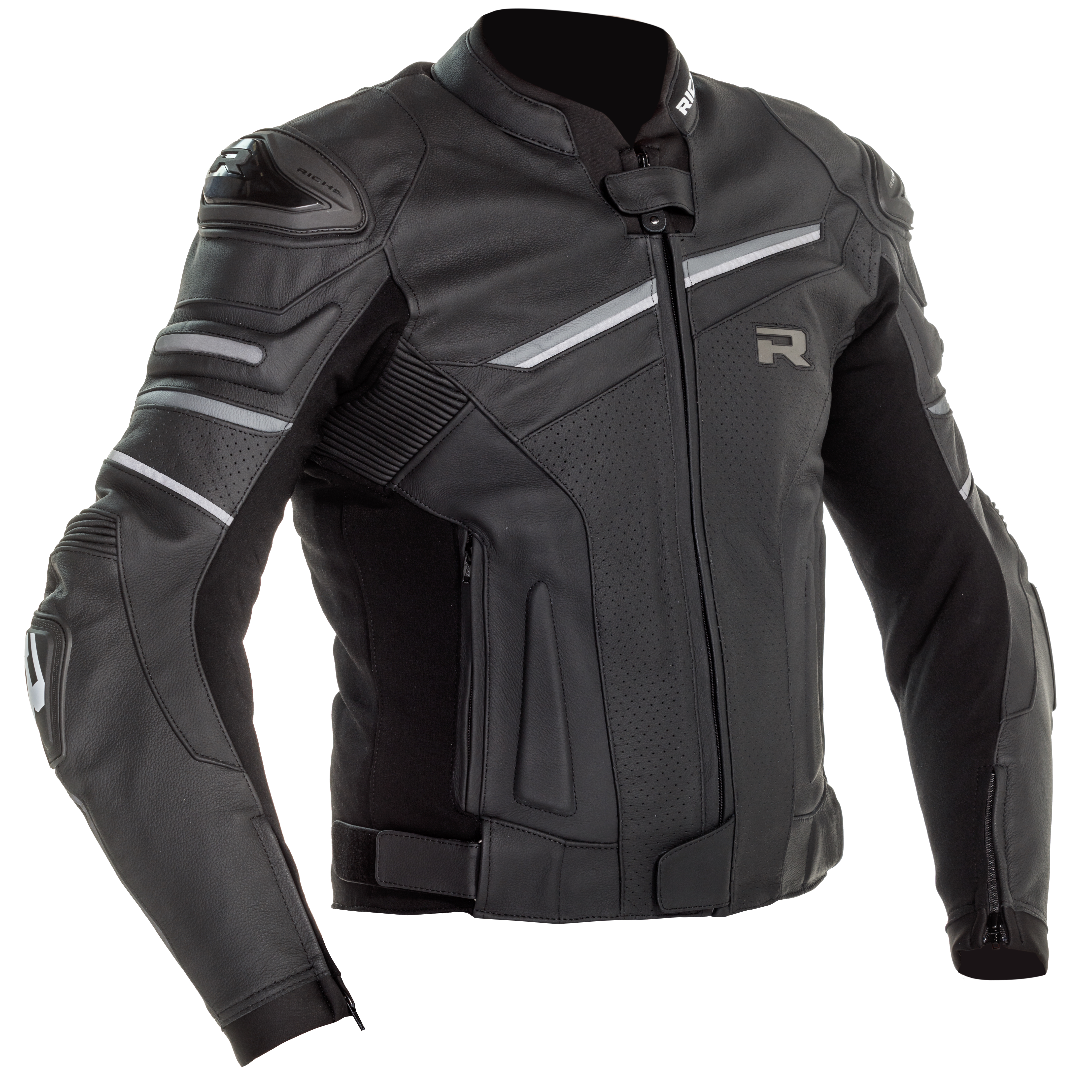 This high-performance 1.3mm cow leather jacket has reinforced stretch aramid zones and a Polymesh lining for comfort and protection. There are CE-approved Level One D3O® protectors at the shoulders and elbows – with the option of back and chest protection too. External caps on the shoulders and elbows offer extra protection from impacts and improve aerodynamics.